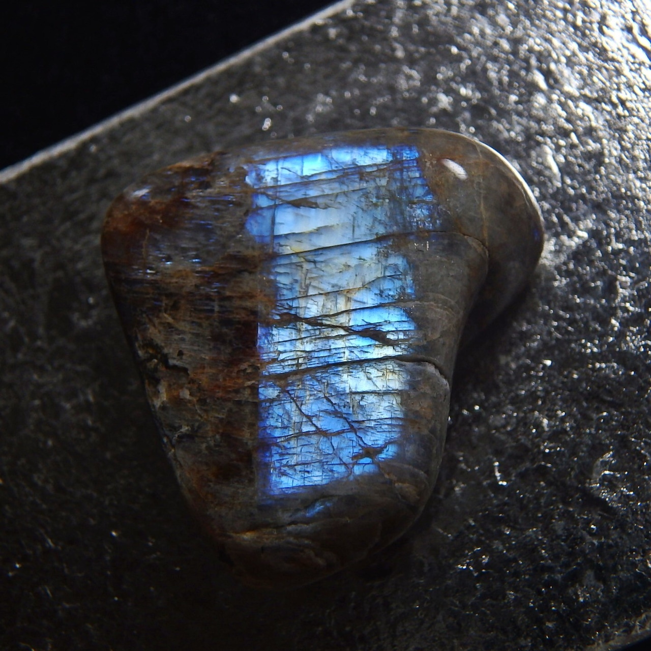 表面は、結晶の境目で上下にくっきり分かれた青いシラーが見られ、角度を変えると、上下どちらも強く光を放ちます。
