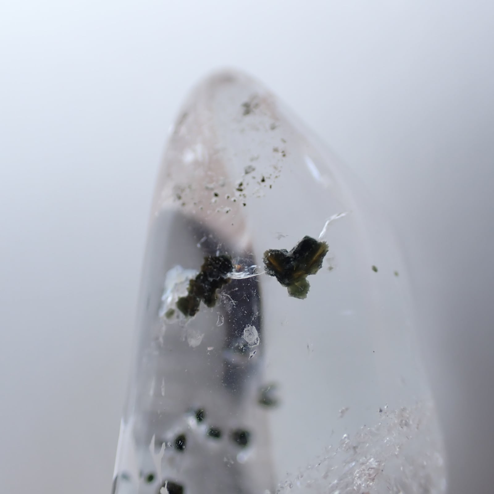 細かく点在する緑泥石は星座を思わせる配置をしており、澄んだ透明感の中に、奥行きのある表情があります。