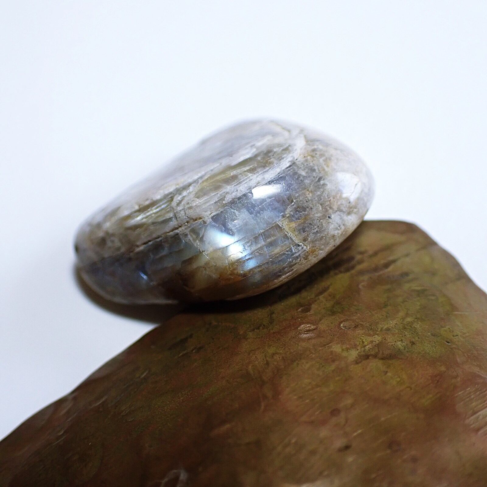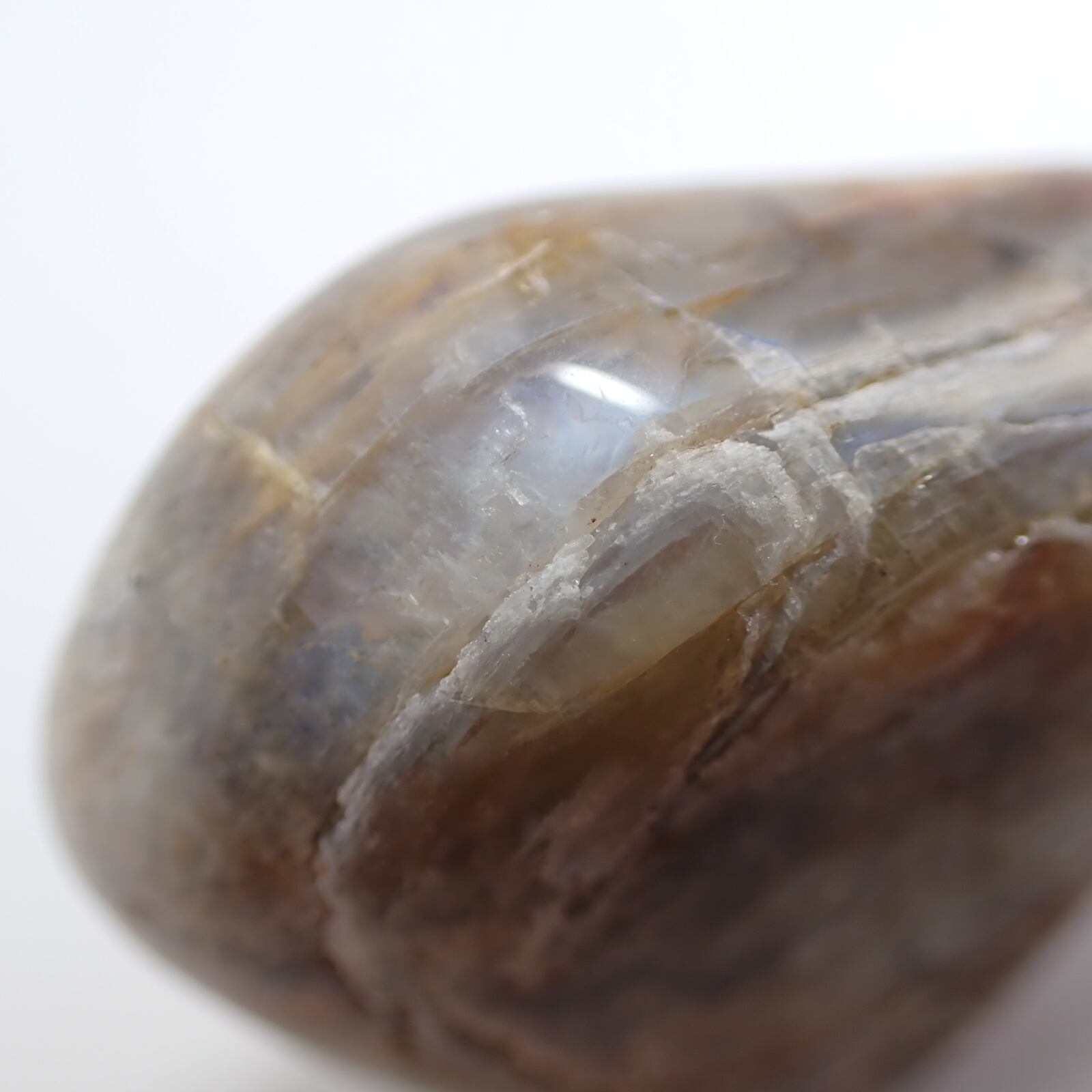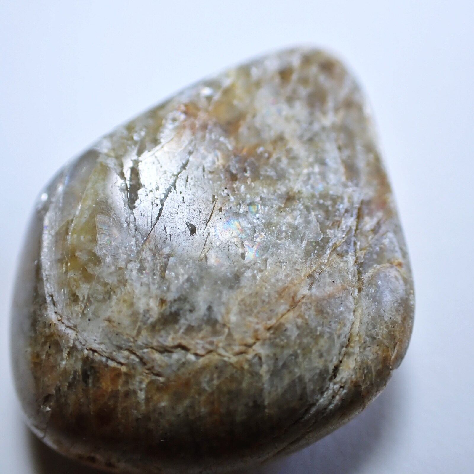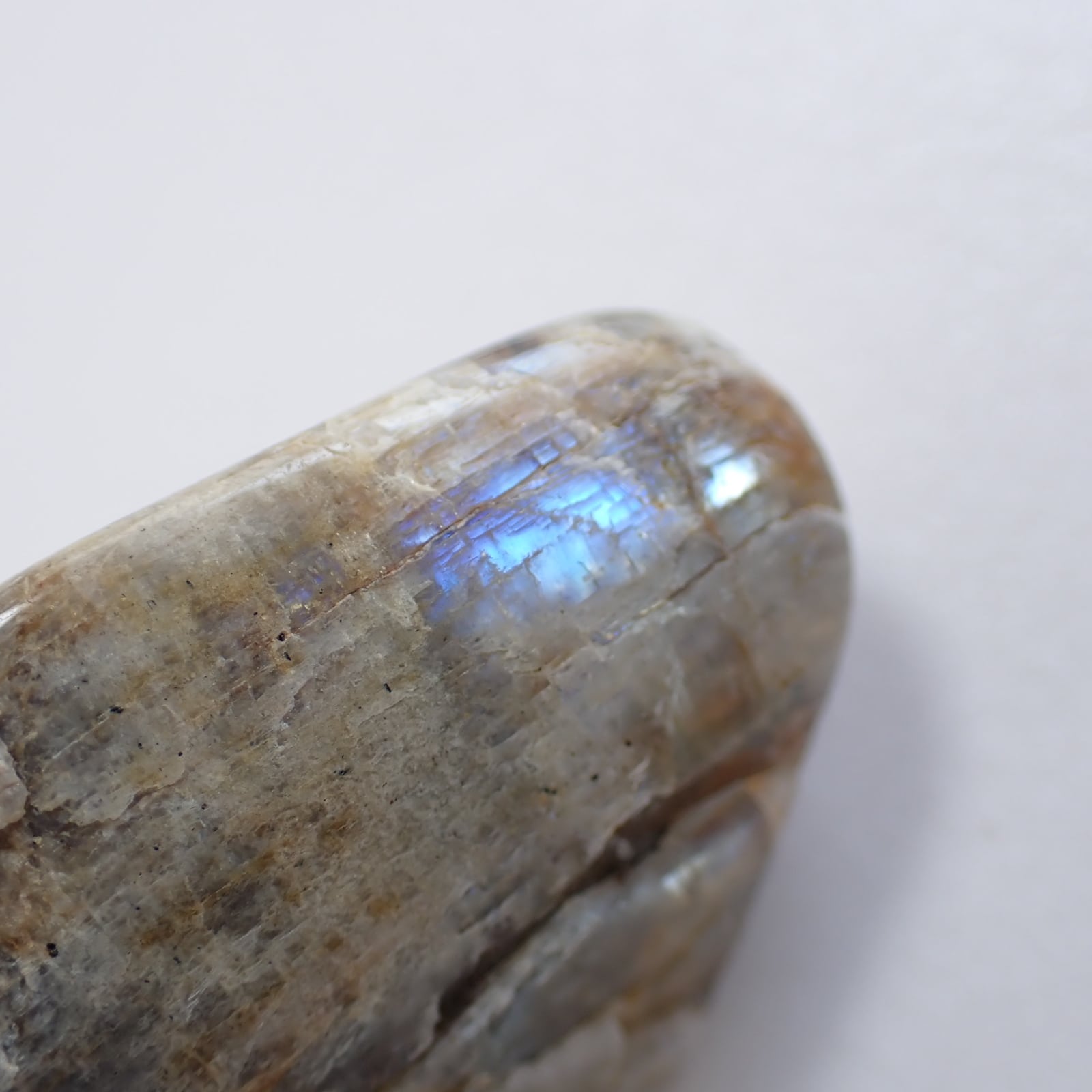 ウィスコンシンムーンストーンは、原石の風合いを活かすよう磨かれており、欠けやヒビ、鉄分による茶色い部分などが多く見られます。
